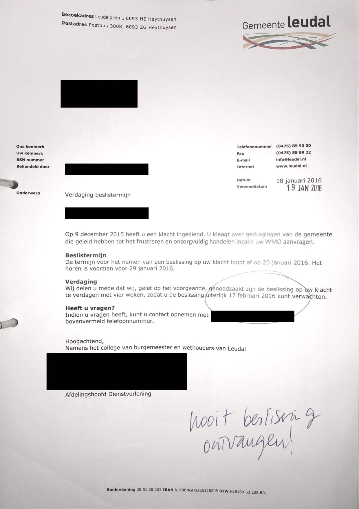 We hebben er smakelijk om gelachen. Vooral dat stukje over “steevast met nieuwe eisen aankomen”. De vereiste aanpassingen voldoen aan de “eisen” van een medisch ergonomisch advies -die er niet zijn om mij te behagen- maar om mijn ongevraagde beperkingen op te heffen. Een advies wat notabene door de uitbrenger op 13 febr 2017 al persoonlijk uit en te na is toegelicht en overhandigd aan de gemeente, en dus aldaar op de plank lag. Al die tijd.