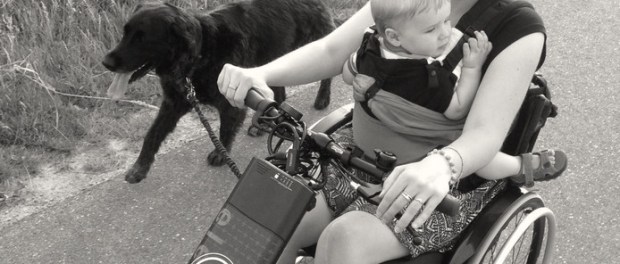 Kim Moorman met zoontje Kick (2) in haar rolstoel, die ze aandrijft met de elektrische handbike die nu gestolen is. Naast haar hulphond Nina (7). © Eigen foto