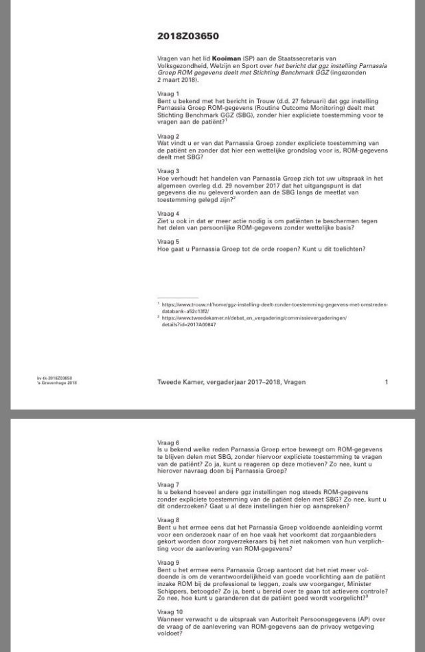 In het memo zegt het bestuur/directie dat Parnassia net als andere GGZ-instellingen in het verleden geanonimiseerde ROM-data aan SBG leverde. Dat is volkomen onjuist en suggereert iets wat er niet was en is. Het gaat namelijk om gepseudonimiseerde data, waarvan juist door de Autoriteit Persoonsgegevens gesteld is dat die ondanks pseudonimisering toch als bijzondere persoonsgegevens beschouwd dienen te worden. Daarom is nu juist expliciete toestemming nodig. Marc Blom, psychiater en bestuurslid van de Parnassia-groep zegt in een berichtwisseling op LinkedIn met een zeer kritische Jim van Os, hoogleraar psychiatrische epidemiologie te Utrecht, dat de data nu geanonimiseerd aangeleverd gaan worden.
