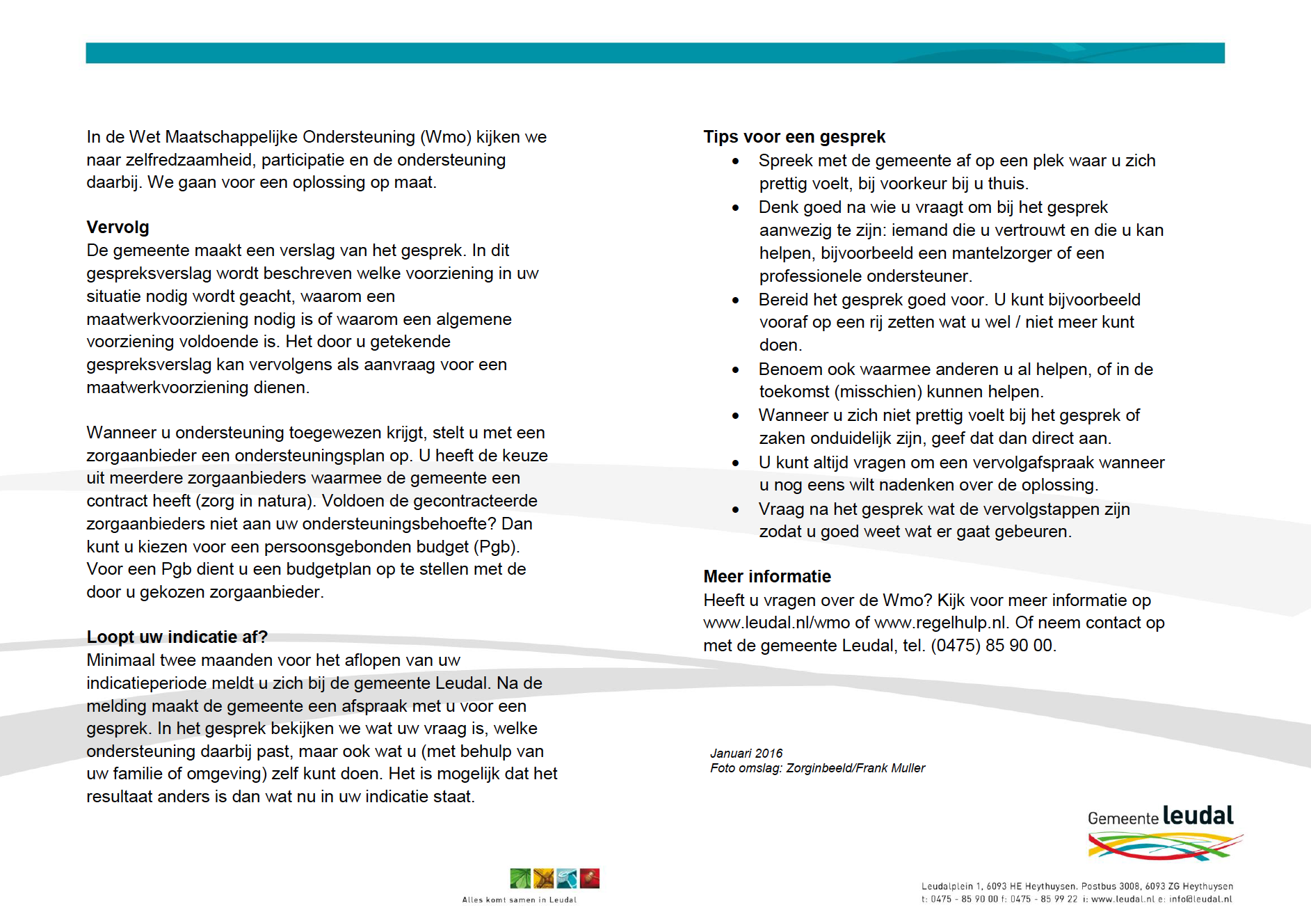 Er ontgaat me even welk gedeelte van uw eigen folder u niet begrijpt. Noch waarom niet conform de inhoud van die folder gereageerd werd noch wordt door de Gemeente Leudal. En die nalatigheid gewoon maar door gaat alsof de Wet WMO ( Art. 2.3.2.8 Wmo, Art. 2.3.2 lid 4 Wmo, en 2.3.2 lid 7 Wmo) en abbb’s hier in het epic centrum van Leudal gewoonweg niet geldig zijn.