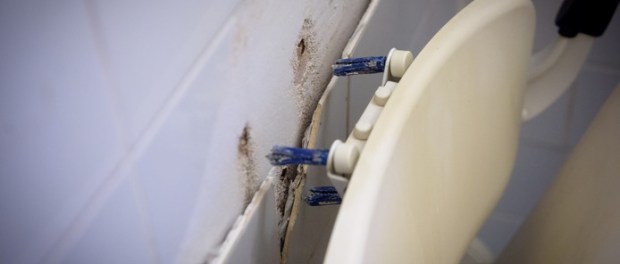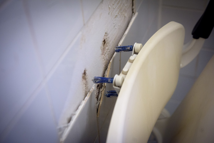 De wand waar de badstoel tegenaan zat oogt inderdaad dun en bros. Ingrid zag al een paar weken eerder dat er daar een probleem dreigde: ,,Een tegel was versplinterd. Ik heb daar ook het Woonbedrijf over gebeld, maar er gebeurde niets.”