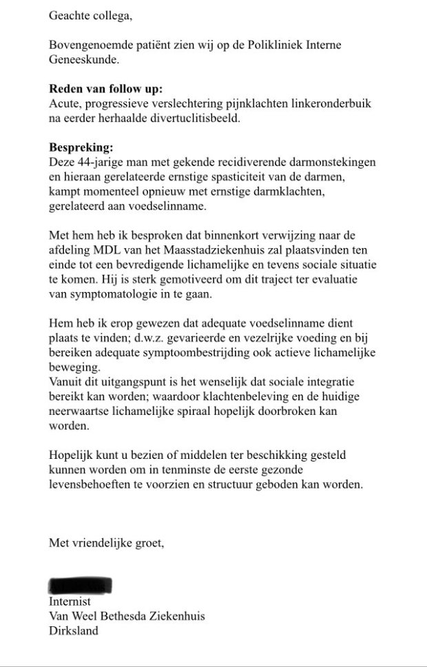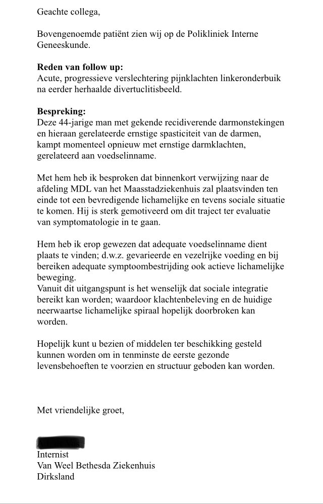 Toch kreeg hij uiteindelijk met alle tegenwerking eromheen, eindelijk een woning toegewezen. Maar nog steeds werd er niets aan de financiële situatie gedaan, wetende wat dit voor zijn gezondheid zou betekenen. Geert heeft ernstige darmklachten getuige dit schrijven van een specialist: